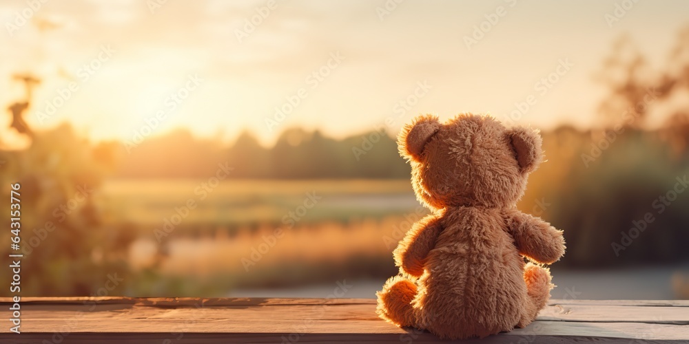 AI Generated. AI Generative. Alone missing one toy doll little bear sitting looking on sunset background landscape outdoor. Graphic Art #643153776