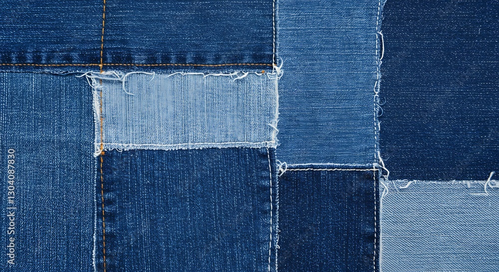 AI-generated illustration of patchwork of various denim fabrics in different shades of blue #1304087830