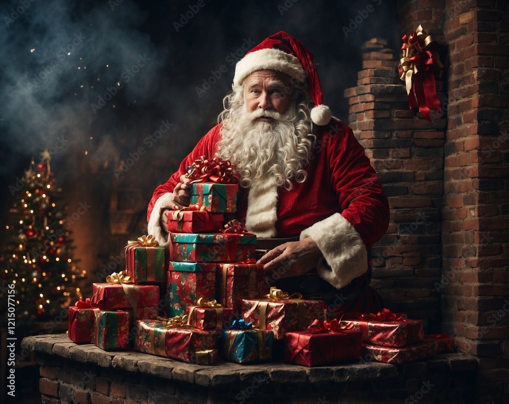 AI-generated image of Santa Claus inside a room filled with presents, capturing the festive spirit and joyful atmosphere of the holiday season. The scene emphasizes warmth, celebration, and holiday ma #1215077156