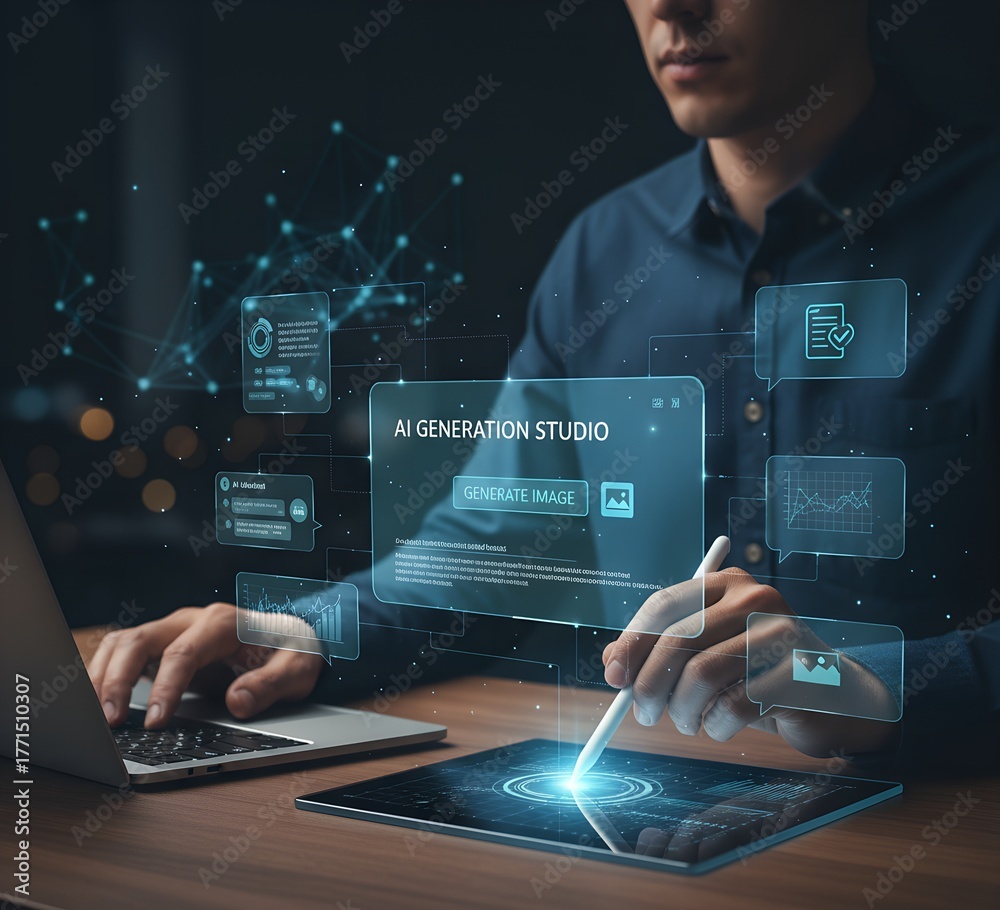 AI generation studio concept. Designer using tablet and laptop to create digital content through artificial intelligence technology. Creative innovation for design automation and smart workflow #1771510307
