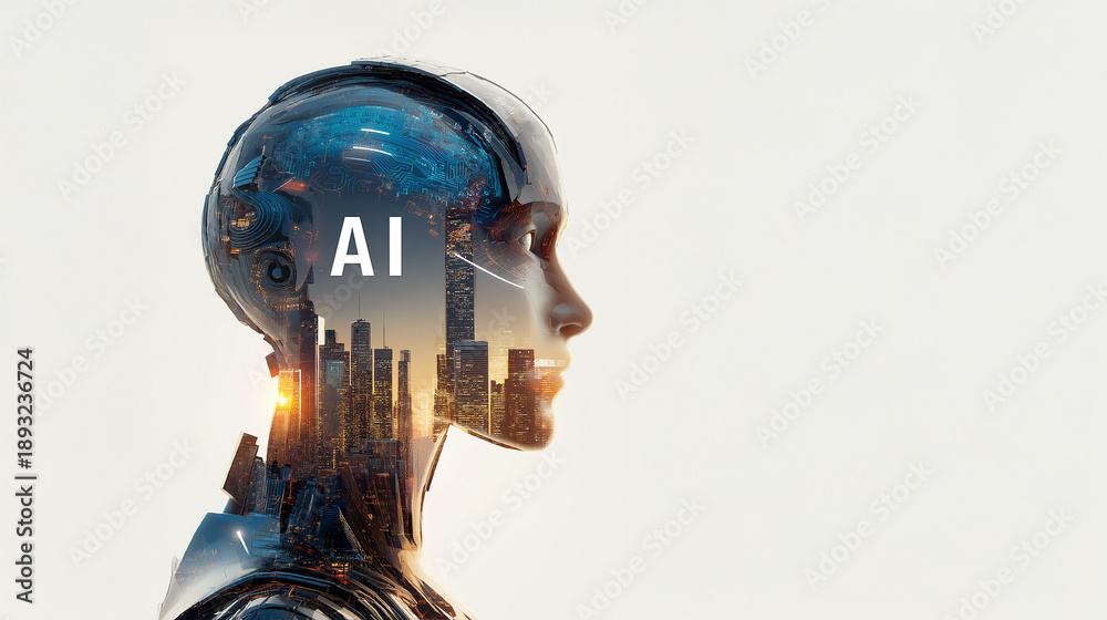 AI humanoid with futuristic cityscape and circuit brain concept #1893236724