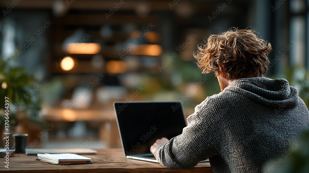 Ai researcher back analyzing data on laptop clean table with notepad and pen minimal office design face hidden #1706404397