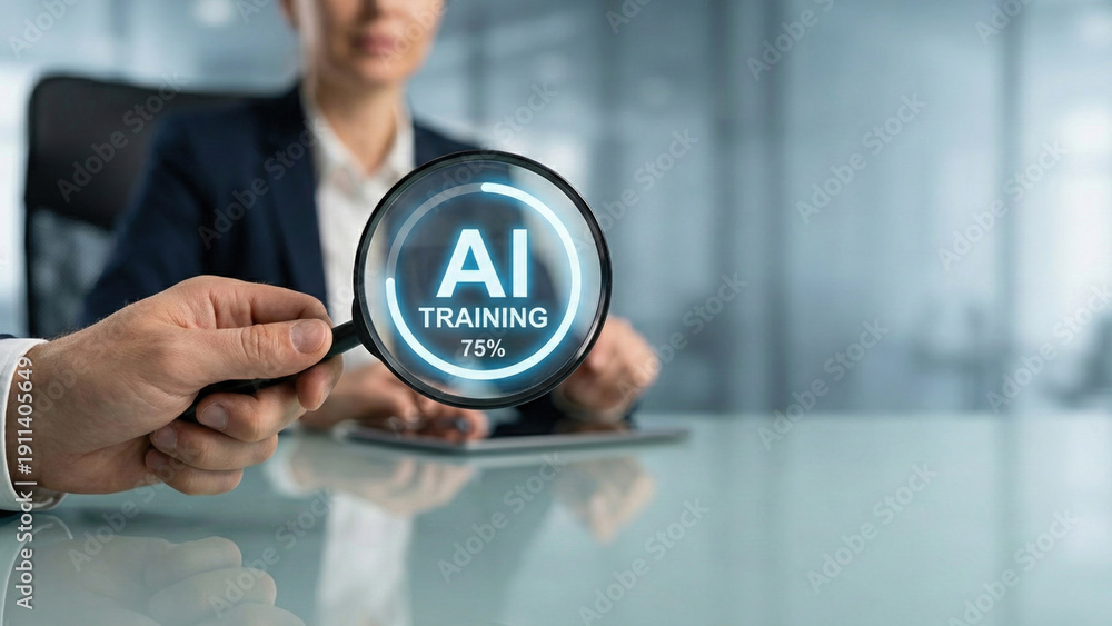 AI training visual machine learning concept with magnifying glass and business professional in office showing progress and focus #1911405649