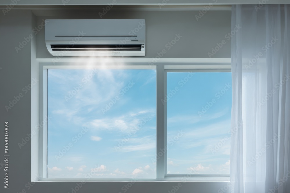 Airconditioner room window curtain vent white ductless unit cooling bright room with sheer curtain and blue sky outside #1958807873