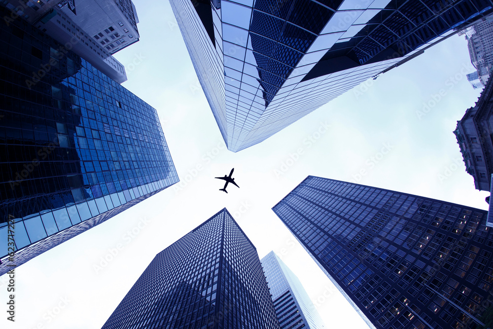 Airplane flies over skyscrapers. Flying passenger jet plane from below. Airplane flying on business skyscrapers of financial center Wall street district in New York City 2024 #623717227