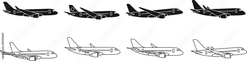Airplane silhouette vector set, featuring commercial passenger jets in side views, black and outline styles, aviation transport graphics for design projects #1870786167