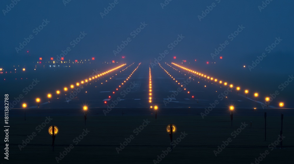 Airport Runway Lights, Night Scene in Foggy Atmosphere, Wide View, copy space. #1811382788