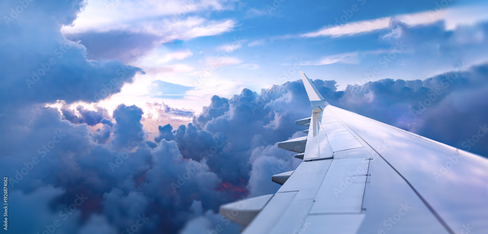 Ala de avión sobre las nubes durante un amanecer colorido.Vista del ala de un avión volando sobre nubes iluminadas con colores vibrantes de amanecer. Escena atmosférica de viaje y perspectiva aérea. #1926874062