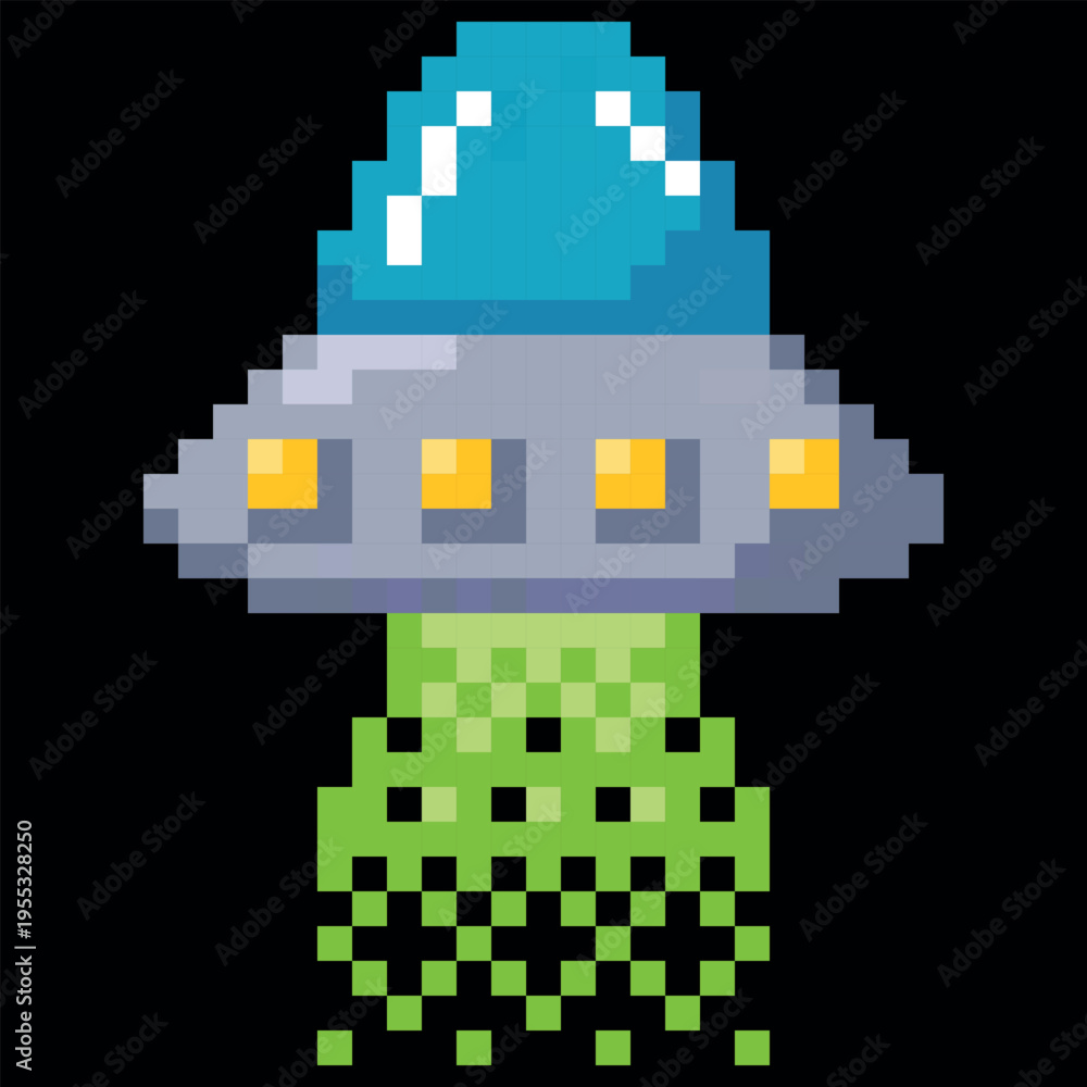 Alien spaceship, UFO spacecraft vector pixel art, cartoon cosmos unidentified round sauce shuttle with green flame #1955328250