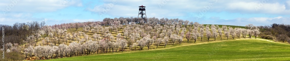 Almond orchard, spring blossoming pink almond orchard #1758629787