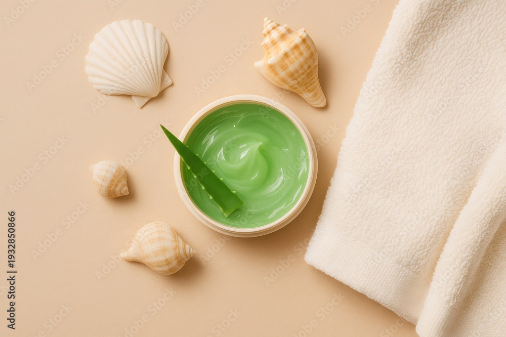 Aloe vera gel in a jar with a fresh leaf, surrounded by seashells and a soft towel, representing natural skincare and spa wellness #1932850866