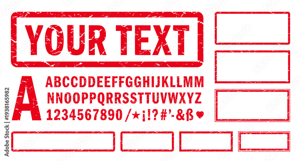 Alphabet, numbers and symbols to create a custom red stamp impression. Different doubled letters. All elements separate #1938165982