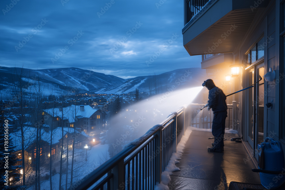 Alpine Condo Balcony Solar With De-Icing Crew Brushing Frosted Panels At Blue Hour, Headlamps, Breath Vapor, Mountain Town Below #1785056560