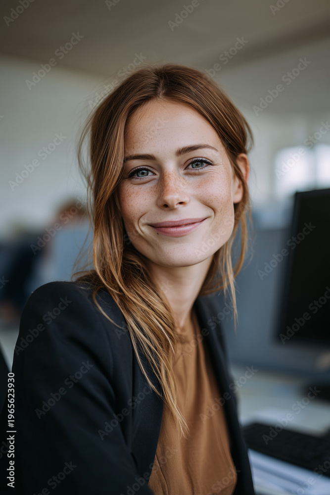 Am Schreibtisch sitzende Sachbearbeiterin lächelt #1965623930