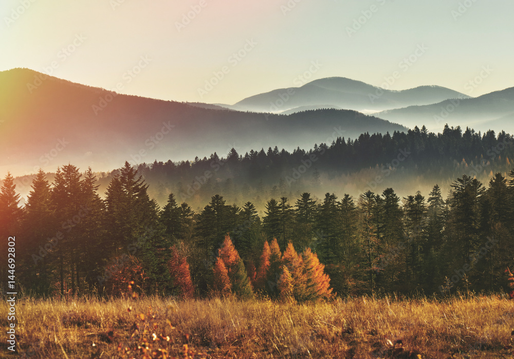Amazing mountain landscape with fog. Beskid Mountains. Poland. Mountains scenery #144692802
