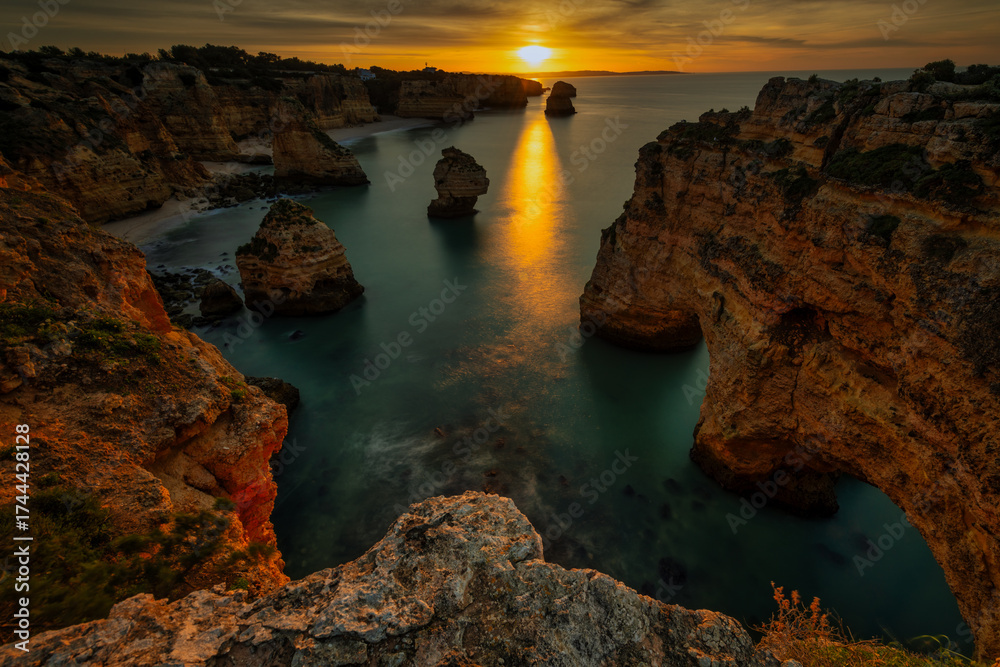 Amazing sunrise at famous beach praia da Marinha, Algarve, Portugal - travel and art concept #1744428128