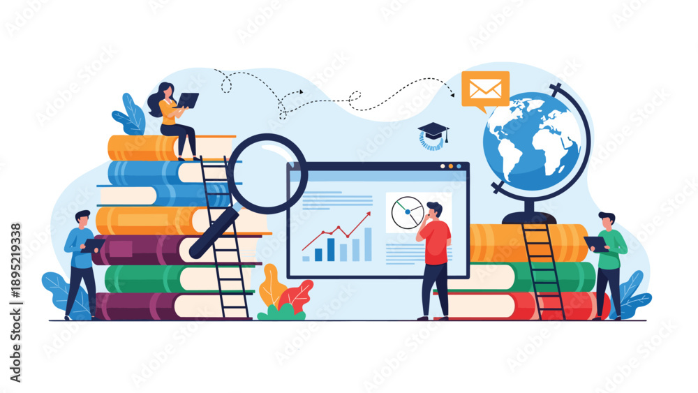 Ambitious students collaborate around large stacks of books using a magnifying glass and laptop to conduct academic research together. #1895219338
