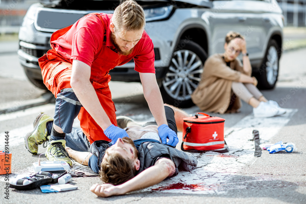 Ambluence worker applying emergency care to the injured bleeding man lying on the pedestrian crossing, dispair woman driver sitting on the background #278914464