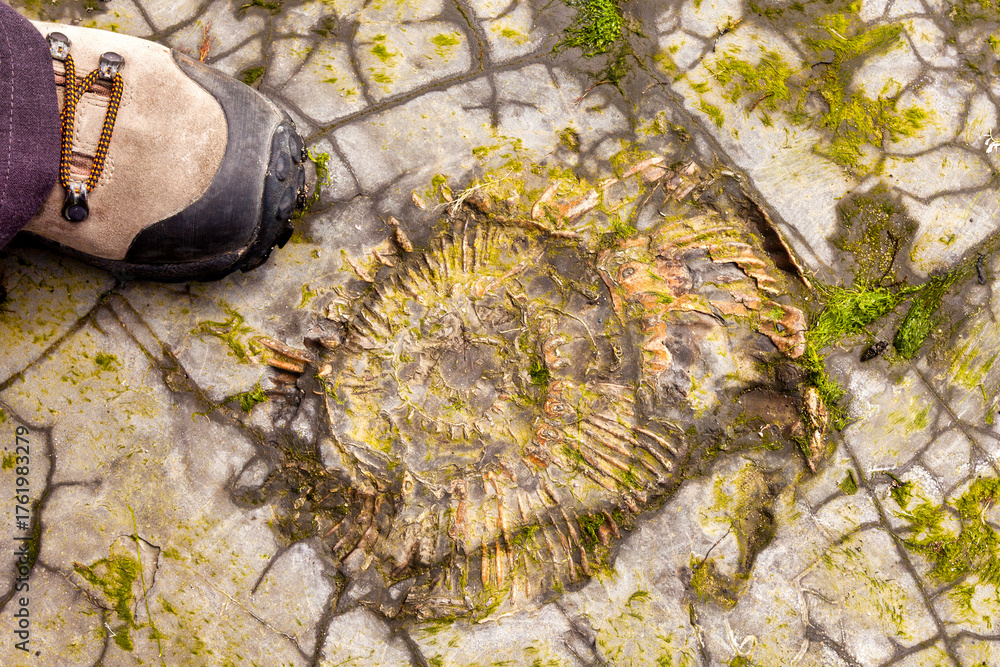 Ammonite fossil revealed on a rock platform at Kimmeridge Bay, Dorset, with woman's boot for scale. These creatures lived in the seas 240 million - 65 million years ago. #1761983279