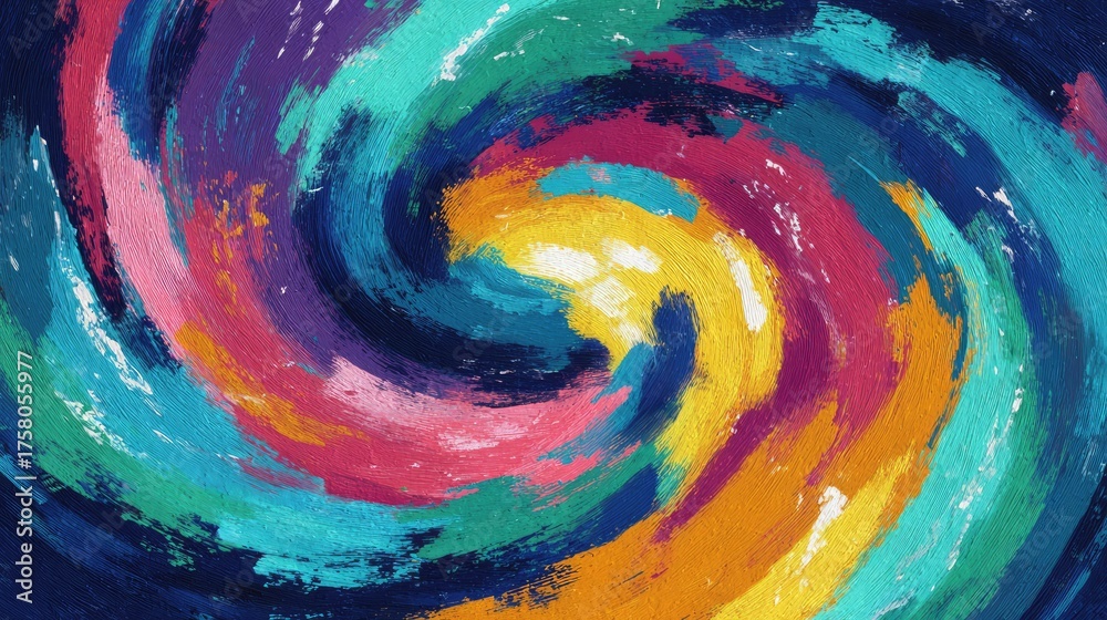 an abstract art piece with vibrant colors. it consists of a spiraling, multicolored design that fills the center, surrounded by splashes of additional colors #1758055977
