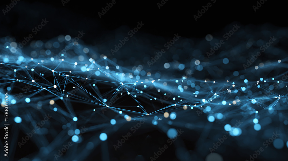 An abstract, futuristic digital network of interconnected nodes glows against a dark background, representing the intricate web of modern technology #1788011795