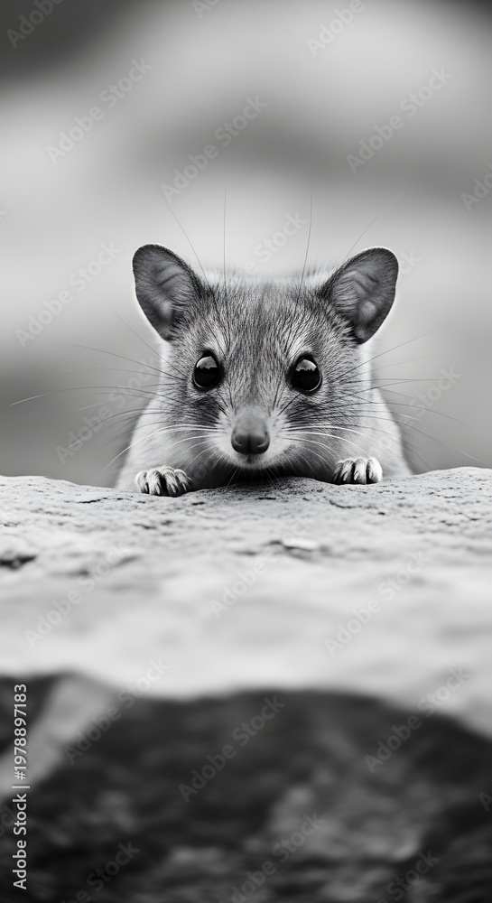 An adorable hyrax emerges from its rocky shelter, captivating viewers with its endearing gaze in striking monochrome. #1978897183