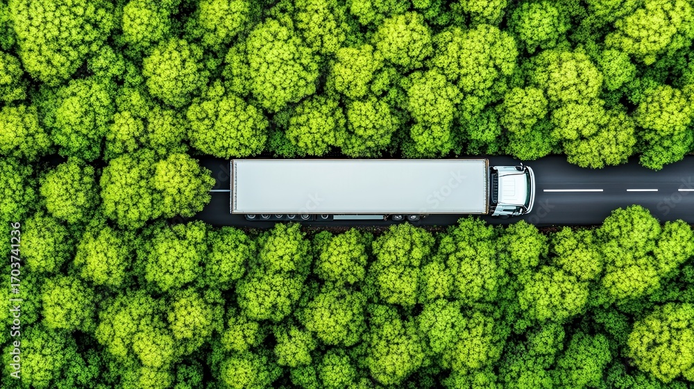 An aerial view of a truck moving through lush green trees captures the essence of transportation in nature, Ideal for logistics, environmental themes, or nature conservation projects, #1703741236