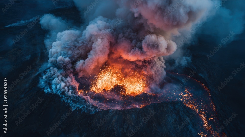 An aerial view of a volcano erupting, with molten lava flowing into the ocean and smoke billowing from its peak. #1925946317
