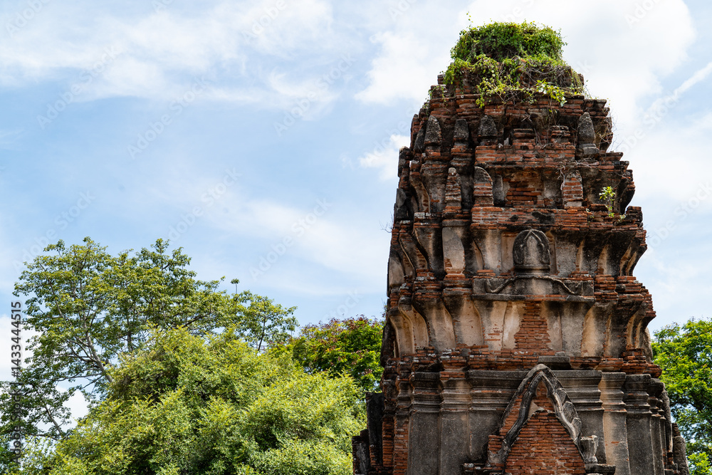 An ancient temple ruin in Ayutthaya, Thailand stands tall with intricate brickwork and faded carvings, partially covered by green vines, set against a blue sky and surrounded by lush green trees. #1433444515