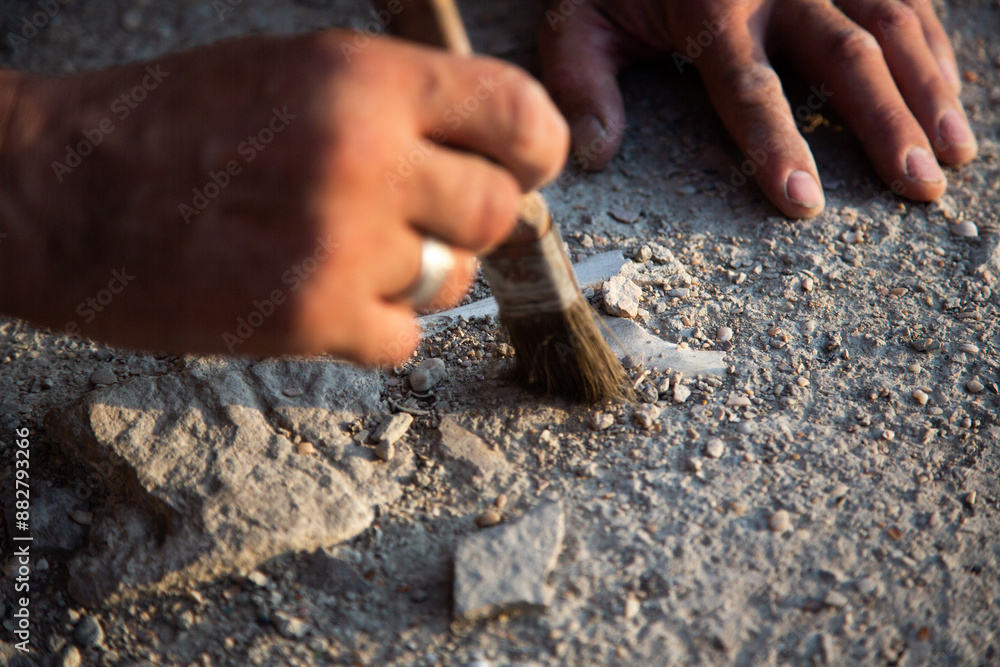 An archaeologist cleans a found artifact in the form of bones with a brush. Historical reconstruction of archaeological research of the 19th century. Close-up on the artifact. Hand in blur #882793266