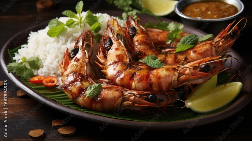 An artfully arranged platter of grilled jumbo prawns, each displaying a charred and smoky exterior, perfectly complemented by a zesty lemoninfused er sauce and a side of fluffy jasmine rice. #667894903