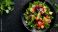 An artistic shot of a dark plate filled with a tropical salad featuring fresh greens, pineapple, avocado, and a light coconut dressing, set against a dark background, #943835712
