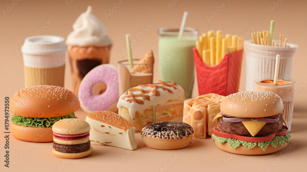 An assortment of miniature food items including burgers fries and various dessert items #1794973550