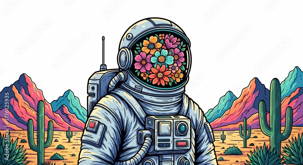 An astronaut stands in a desert landscape, his helmet filled with colorful flowers, creating a surreal and vibrant scene. #1776125935