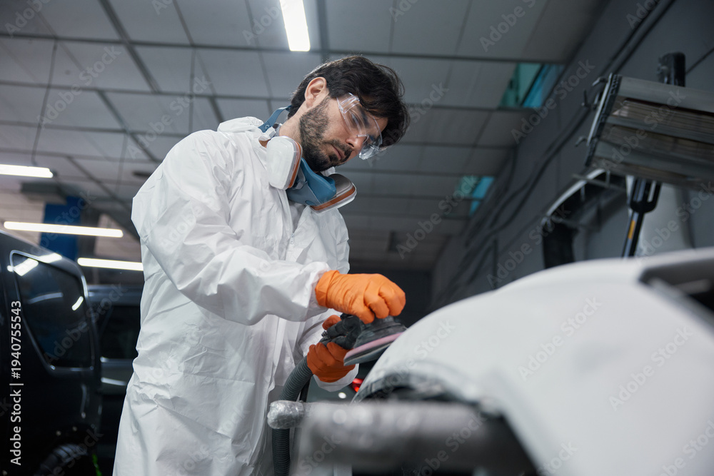 An automotive technician is repairing a car bumper in a workshop while wearing safety gear #1940755543