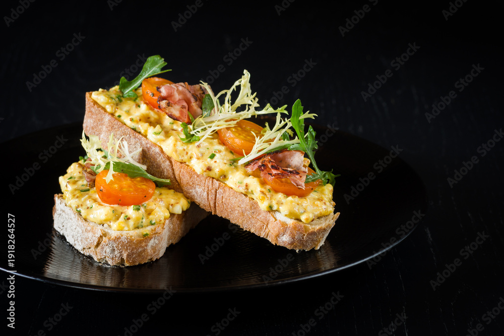 An egg mayonnaise open sandwich with tomatoes, salad and bacon on slices of bread on a plate #1918264527