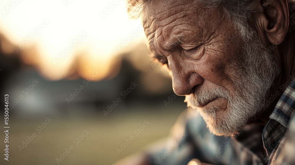 An elderly man with a white beard deeply engages with his guitar, reflecting on life and music as the sunset casts a warm glow around him. #1550046113