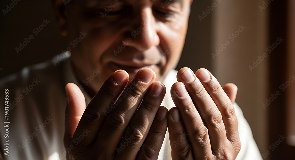 An elderly man with his hands clasped together in prayer or contemplation #1901743533