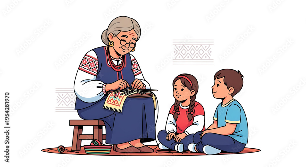 An elderly woman teaches traditional needlework to two attentive children in a cozy setting. #1954281970