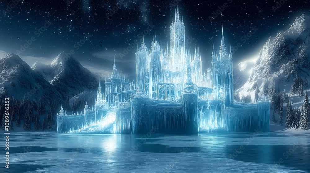 An elegant ice palace with intricate frosted designs, surrounded by a frozen lake and towering snow covered mountains, under a starry night sky. Frozen Ice Palace. Illustration #1089616252