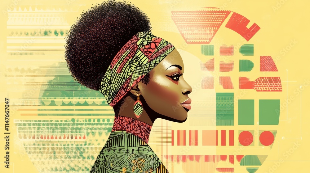 An elegant illustration of a Black woman with natural hair styled in a traditional wrap, overlaid with intricate patterns inspired by African art #1147667047