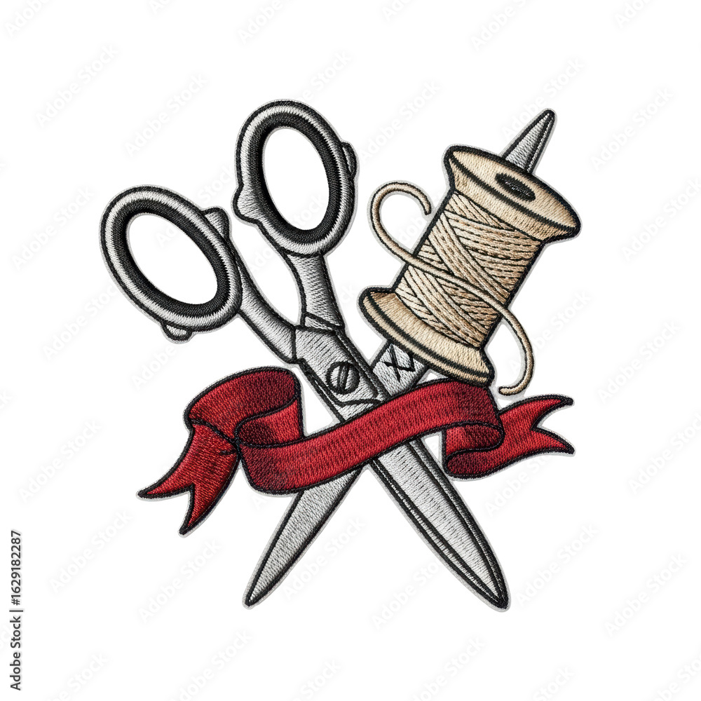 An embroidered patch design showcasing crossed sewing scissors, a thread spool with a needle, and a flowing red banner, ideal for craft and fashion themes. #1629182287