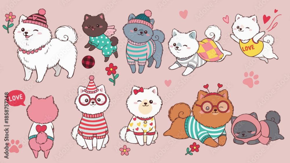 An endearing collection of charming cartoon dogs dressed in a variety of delightful outfits, perfect for heartwarming pet-themed designs and sweet animal illustrations #1858757248