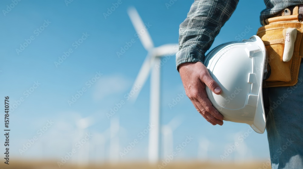 An engineer stands with a hard hat, wind turbines in the background, symbolizing renewable energy and innovation. #1578410776