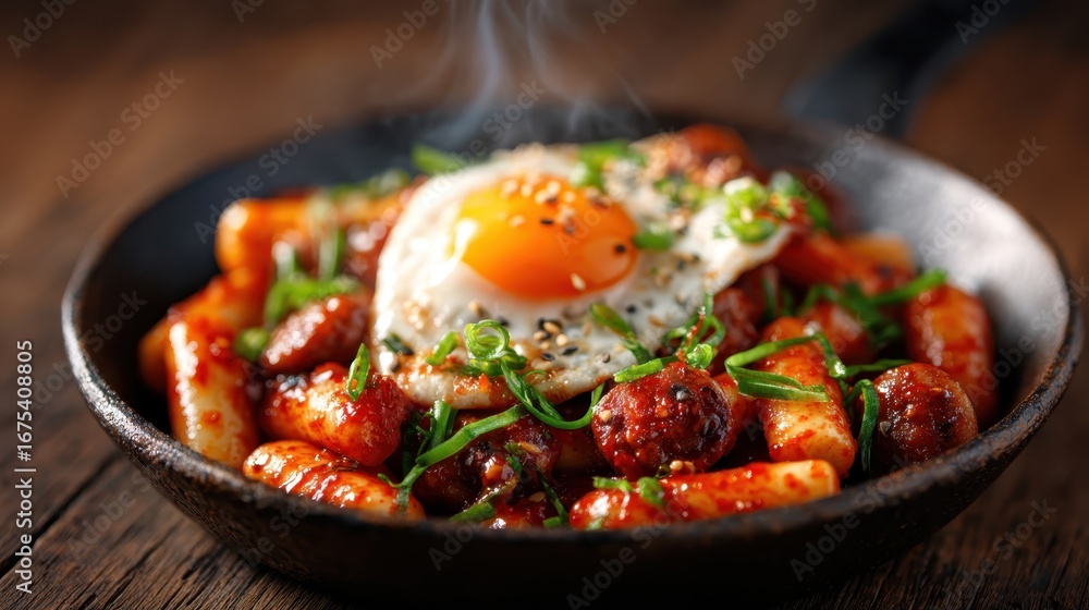 An enticing dish of spicy Korean tteokbokki served in a sizzling pan garnished with a fried egg, adding an element of warmth, tradition, and culinary delight to your meal. #1675408805