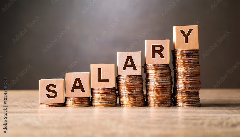 An ever-increasing pile of coins, with the letters S A L A R Y arranged on separate blocks placed on top of each pile of coins. #1024308769