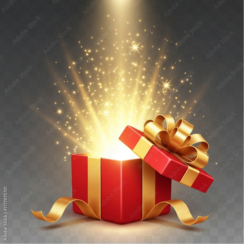 An eye-catching image features a beautifully wrapped gift box with a shining light spilling out, evoking feelings of excitement and anticipation for the special occasion. vector illustration #1777975701