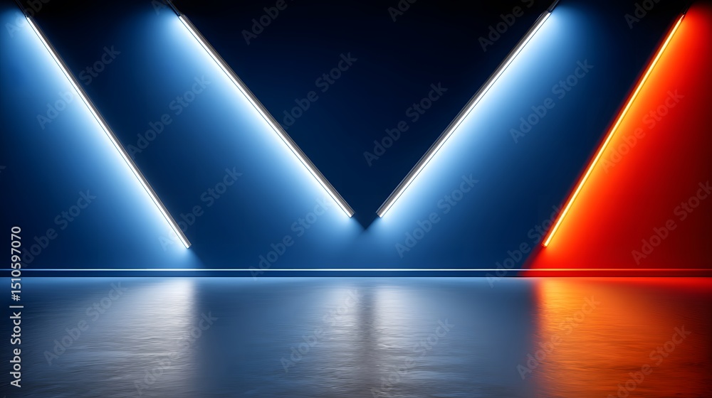 An illuminated studio features vibrant blue and red neon lights creating a modern aesthetic in a spacious and reflective setting ideal for various projects. #1510597070