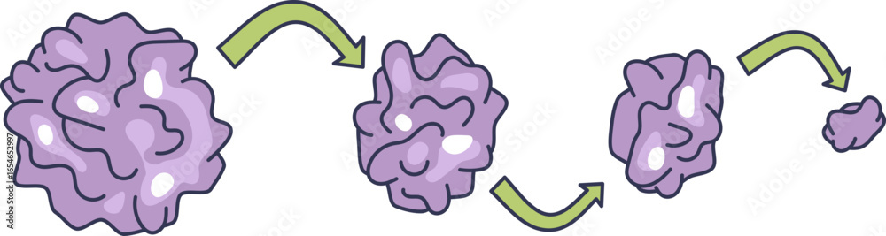 An illustration of a cancer tumor shrinking, showing successful treatment. The purple cell mass progressively reduces in size, symbolizing tumor regression and the effects of oncology therapy. #1654652997