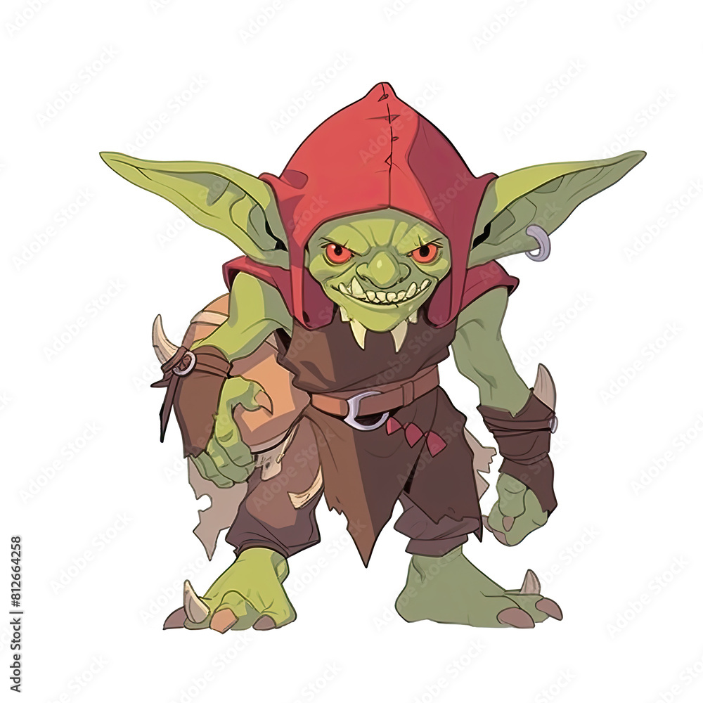 An illustration of a goblin with a green body and long ears looking at the camera #812664258